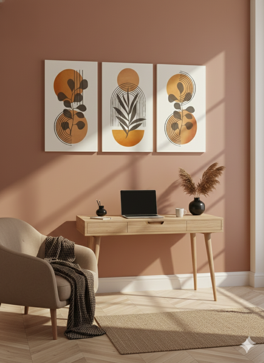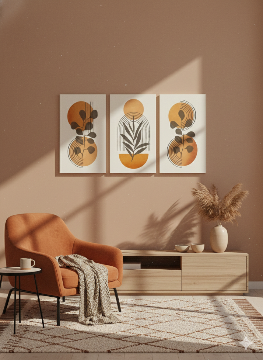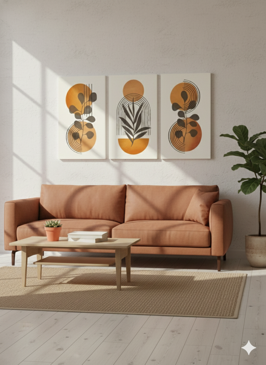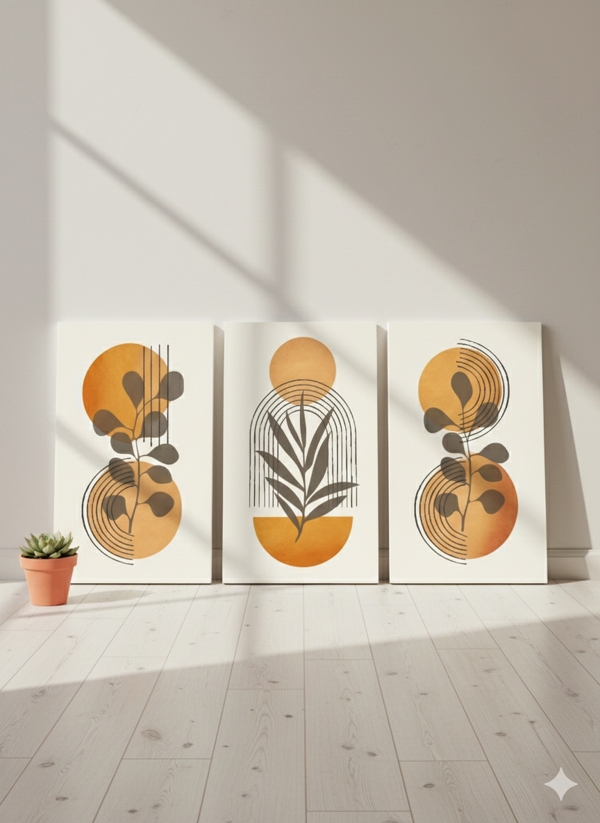 Gün, sıcak turuncu ve sarı tonlarının modern çizgiler ve botanik siluetlerle birleştiği enerjik bir üçlü kanvas tablo setidir. Güneşin doğuşunu andıran parlak tonlar, yaşam alanına canlılık, pozitiflik ve aydınlık bir atmosfer kazandırır.